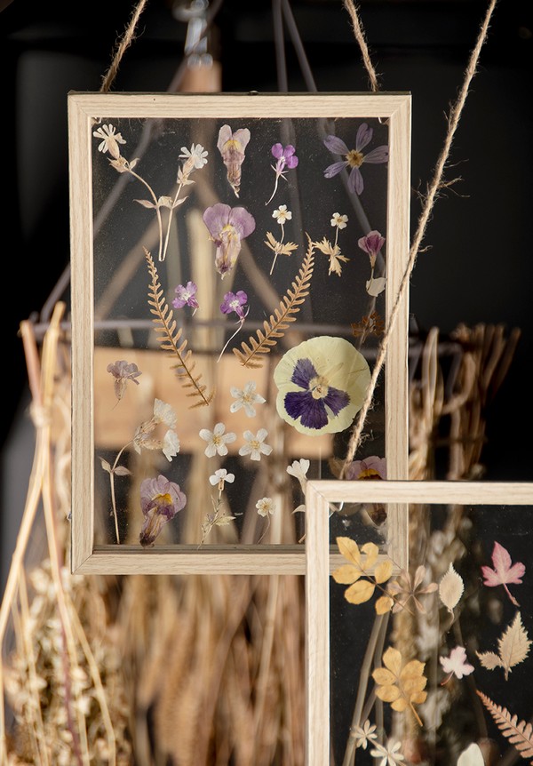 מסגרת עץ, המכילה זכוכית דו צדדית, הניתנת להורדה ושמירה והצגה של פרחים יבשים, עלים, נוצות ושאר קישוטים. ניתן לתליה. מבית ESSCHERT DESIGN, הולנד