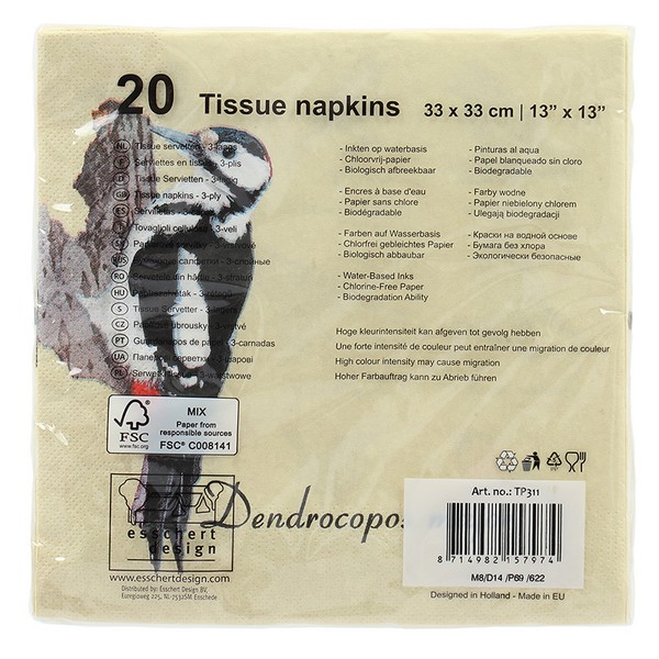 מארז של 20 מפיות נייר תלת שכבתיות מעוצבות, בהדפס ציפור נקר, מבית ESSCHERT DESIGN, הולנד