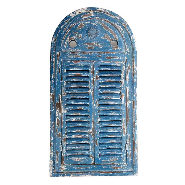 מראה דקורטיבית בעיצוב חלון ישן, בצבע כחול, יוצרת מרחב חזותי בבית ובגינה, התריסים ניתנים לפתיחה וסגירה, ניתנת לתליה. מבית ESSCHERT DESIGN, הולנד